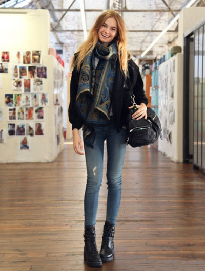 華麗的印花圍巾給人一種奢侈的感覺,搭配簡答的緊身牛仔褲,馬丁靴和黑色短款外套,干練而優(yōu)雅的氣質(zhì)迎面而來。