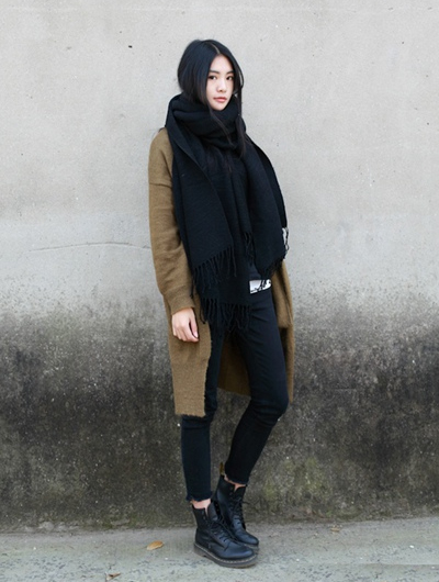 寬大的黑色羊絨圍巾就算圍了好幾圈還是夠長,適合高妹搭配大衣和長款毛衣,有型有款又溫暖無比。