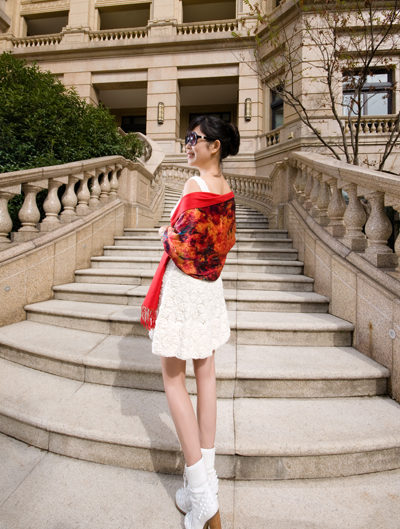 印花圍巾還是比較適合氣質(zhì)成熟的辦公室女性,搭配白色連衣裙,優(yōu)雅動人。
