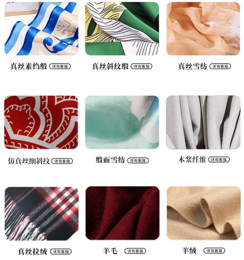 絲巾的款式尺寸包括小方巾、窄長(zhǎng)細(xì)絲巾等多種,客戶可以根據(jù)需求定制尺寸,如90*90、90*140等。