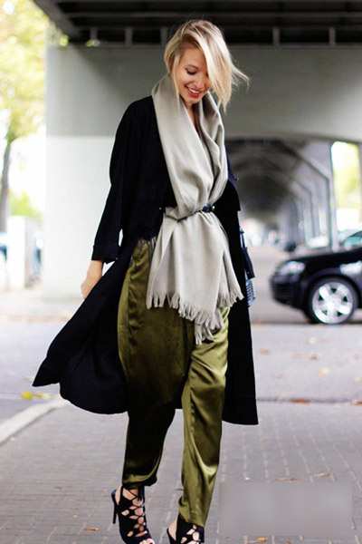 純色圍巾不管過多久都不會過時(shí),在腰間系上腰帶,圍巾瞬間就變做了一件上衣,搭配長外套,時(shí)尚街拍好look。