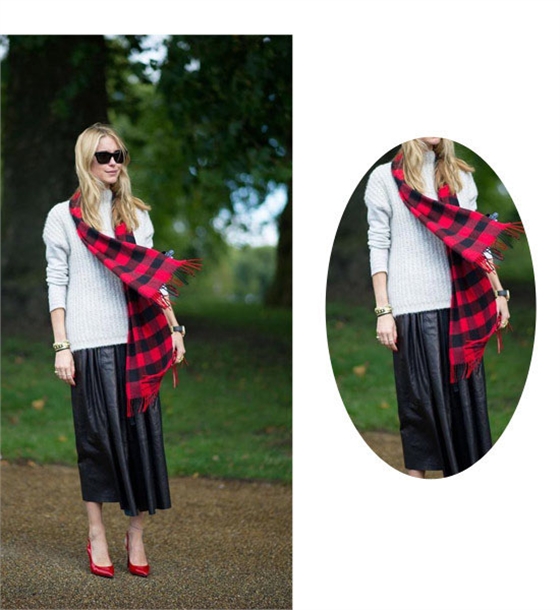 【搭配示范】:高領毛衣+半身長皮裙+紅色格子圍巾+紅色尖頭高跟鞋