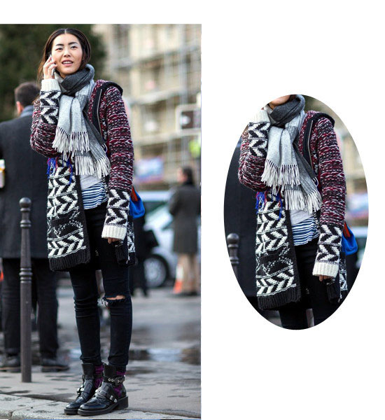 【搭配示范】:灰白格子圍巾+針織開衫+緊身牛仔褲+鉚釘短靴
