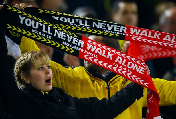 這顯然并不是多特蒙德單方面向紅軍球迷示好,畢竟這首歌已經(jīng)在客隊球迷中廣為傳唱。多特蒙德這邊南看臺的地位如同利物浦的KOP,大黃蜂死忠從1996年起也唱起了同樣的旋律。