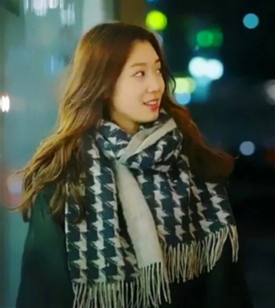 樸信惠在電視劇《匹諾曹》當(dāng)中,也曾穿戴著千鳥格圍巾出鏡,可愛又休閑,符合樸信惠年輕可愛的特點。這里的妙處在于千鳥格圍巾和素色圍巾相搭配,增添了造型感。