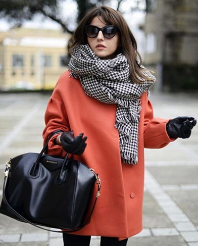 街拍達人將千鳥格圍巾和橙色繭型大衣相搭配??刹灰?/span>為千鳥格大衣只可以與顏色素凈的大衣、毛衣或針織衫相搭配,和鮮明活潑的橙色搭配,依然是朝氣蓬勃,優(yōu)雅和時尚并存。