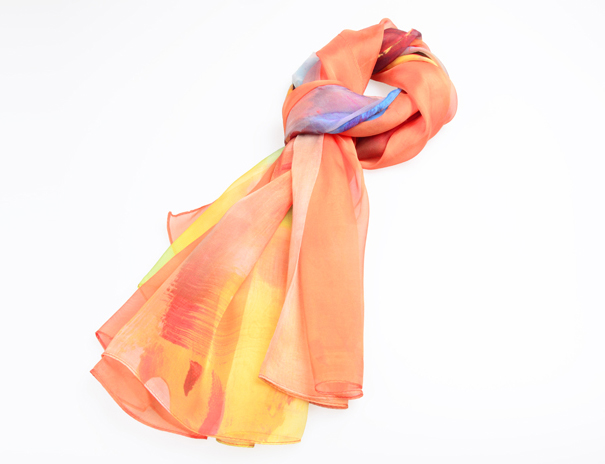 手繪工藝:就是圍巾本來是素色的一塊布料,用水彩在上面畫畫,然后用化學(xué)物質(zhì)固色的圍巾。這種圍巾有特色而特別,根據(jù)想象可以隨意發(fā)揮。