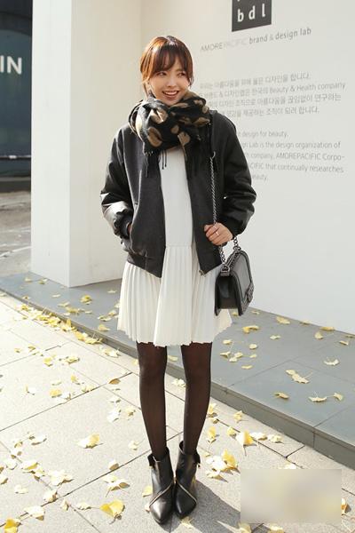 粉色系的圍巾襯托女孩甜美清純的氣質,讓本來有些中性化的帥氣穿搭增添了少女般的柔美味道,配上光潔的丸子頭,顯得清新可愛極了。