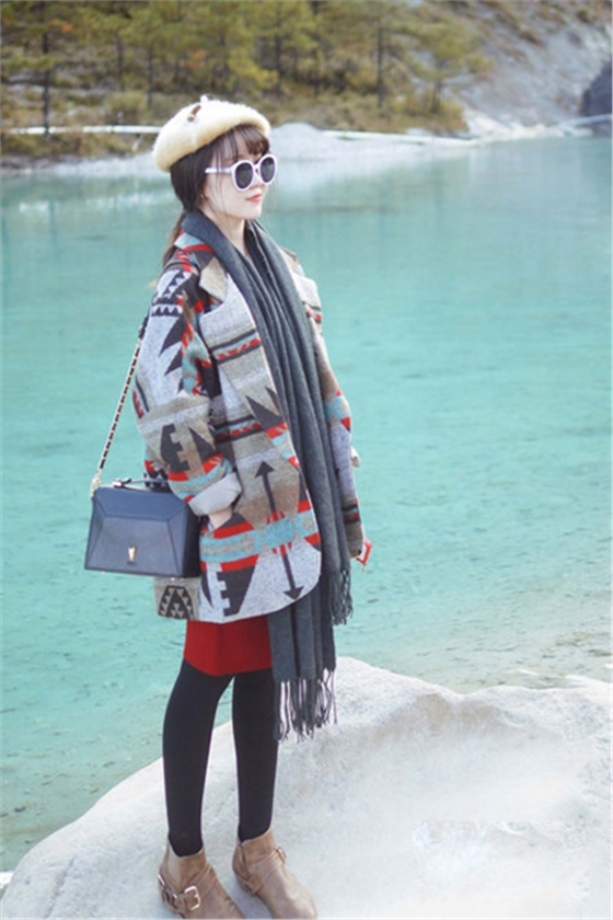 Look 2:深灰色純色搭配幾何圖案大衣,內(nèi)搭紅色包裙,時尚潮流,配飾的搭配更加顯現(xiàn)出與眾不同的時尚質(zhì)感。