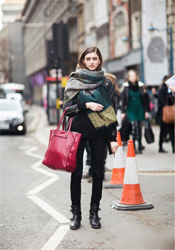 黑色皮質(zhì)外套搭配黑色毛衣,下身是黑色緊身褲與黑色金屬扣飾短靴,紅色休閑皮包,毛毯披肩的加入,讓整個(gè)造型更添冬日氣息,增加色彩元素。