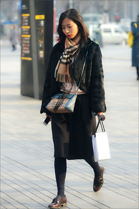 皮草小外套加包裙,圍巾提亮,既保暖又優(yōu)雅。
