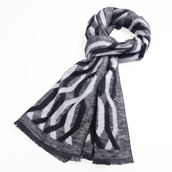 在設(shè)計中線具有一定的長度和寬度,直線和曲線為兩大類,不同特征的線給人們不同的感受。圍巾設(shè)計中若以直線作為設(shè)計點,則給人一種單純、理性平穩(wěn)的感覺;若以曲線這一種極具韻味的線型,則給人溫和、柔和的感覺。因此新昌龍翔設(shè)計師設(shè)計出了多款線條圍巾。