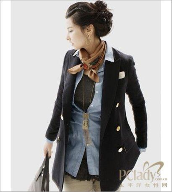 時尚點(diǎn)評:既然有嚴(yán)肅感的主管當(dāng)然也有親和力的主管,屬下的職員喜歡與親切的你接近,當(dāng)然工作中還是要展現(xiàn)出自己應(yīng)有的威信和原則。粉色系的上衣外套加上花邊的裝飾將干練的你展現(xiàn)出一絲溫柔感,而深藍(lán)色的絲巾能夠表現(xiàn)出低調(diào)的華麗感,也平衡了柔和增加了主管的嚴(yán)肅。